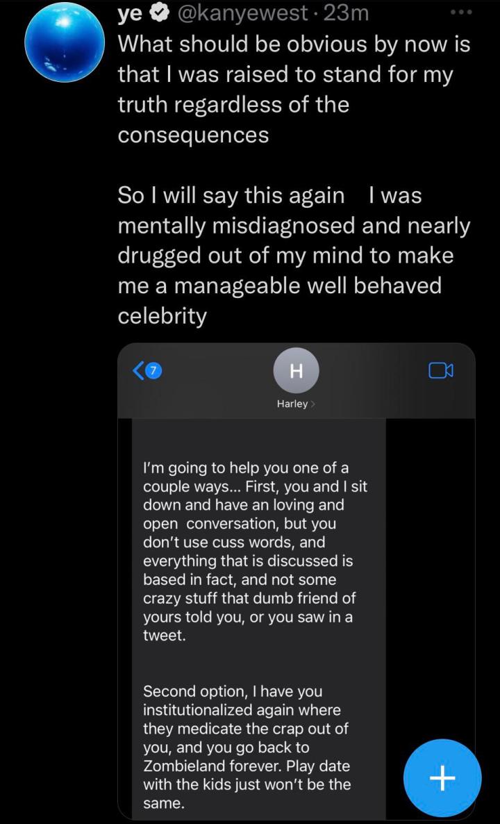 In the mix of all this, Ye had posted a tweet of a screenshot of a message, between himself and his personal trainer that would give a glimpse into Ye’s shadowy world.