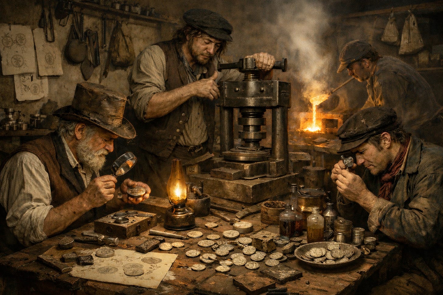 In pre–Civil War America, currency was radically fragmented: private bank notes of wildly varying credibility, state issues, foreign coins, barter systems, and later Union greenbacks all circulated simultaneously. There was no unified standard and little reliable oversight. Trust was local. Verification was slow. This monetary fog created a perfect operating environment. Counterfeiting wasn’t merely fraud—it was liquidity. It was how payroll moved when banks were days away by river or horse. It was how bribes were funded when hard specie was scarce. It was how operations scaled quietly, without drawing the attention that large transfers of legitimate capital would have triggered.