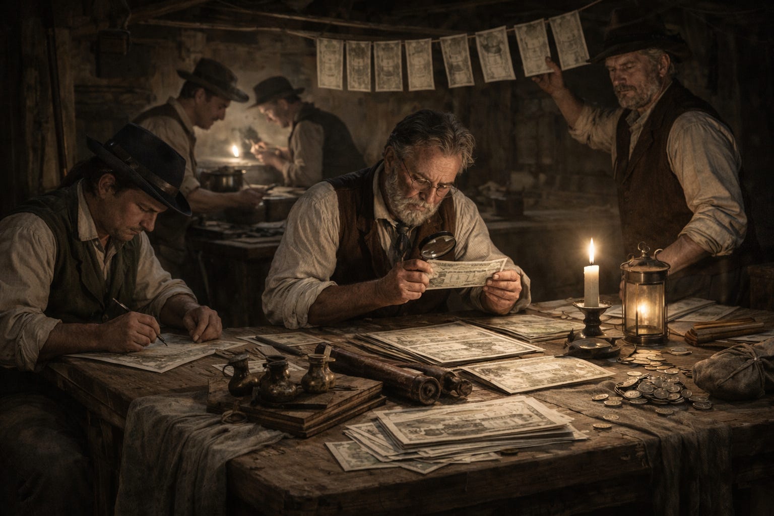 In pre–Civil War America, currency was radically fragmented: private bank notes of wildly varying credibility, state issues, foreign coins, barter systems, and later Union greenbacks all circulated simultaneously. There was no unified standard and little reliable oversight. Trust was local. Verification was slow. This monetary fog created a perfect operating environment. Counterfeiting wasn’t merely fraud—it was liquidity. It was how payroll moved when banks were days away by river or horse. It was how bribes were funded when hard specie was scarce. It was how operations scaled quietly, without drawing the attention that large transfers of legitimate capital would have triggered.