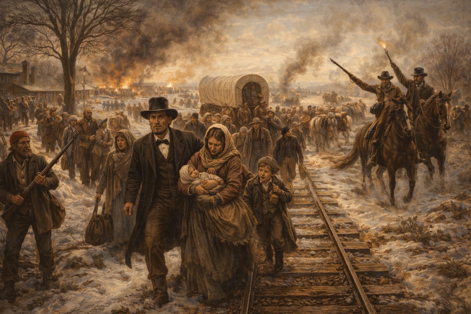 During Ford’s administration, escalating local violence, militia mobilizations, and political paralysis culminate in the killing of Joseph Smith and the unraveling of Nauvoo—events that occur not by formal extermination order, but on Ford’s watch, inside his state, amid fractured authority. Property is seized, communities collapse, and populations ultimately move westward—first through executive violence in Missouri, then through accumulated coercion and breakdown of protection in Illinois.