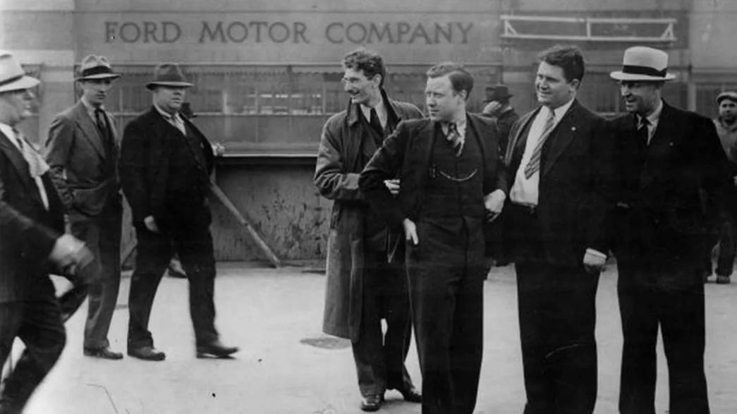 As unions rise, Ford becomes famously hostile to organized labor. His company’s Service Department—run by Harry Bennett—functions as an internal security apparatus: surveillance, intimidation, strikebreaking, and discipline carried out with the methods of a private police force. The violence becomes public in episodes like the 1932 Ford Hunger March and the 1937 Battle of the Overpass, where union organizers are beaten while cameras roll. At the same time, Ford’s public politics harden into nativist ideology, including antisemitic publishing through the Dearborn Independent and the dissemination of The International Jew.