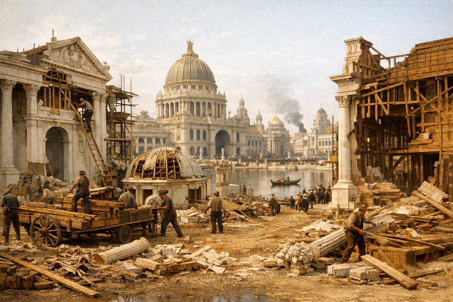 Nineteenth-century exposition architecture offers a particularly instructive cautionary case for understanding the material logic behind the so‑called loss attributed to Tartaria. Urban environments that appear in surviving photographs as monumental marble cities—most famously the “White Cities” of world’s fairs—were, in fact, purpose-built spectacles constructed using deliberately impermanent techniques: plaster composites, timber framing, staff ornament, and theatrical facades engineered to simulate monumentality without committing resources to durability. These cities were designed to exist briefly, to coordinate labor, capital, and circulation for a finite interval, and then to vanish once their function had been fulfilled. Their dismantling was not concealment, nor failure, but completion.