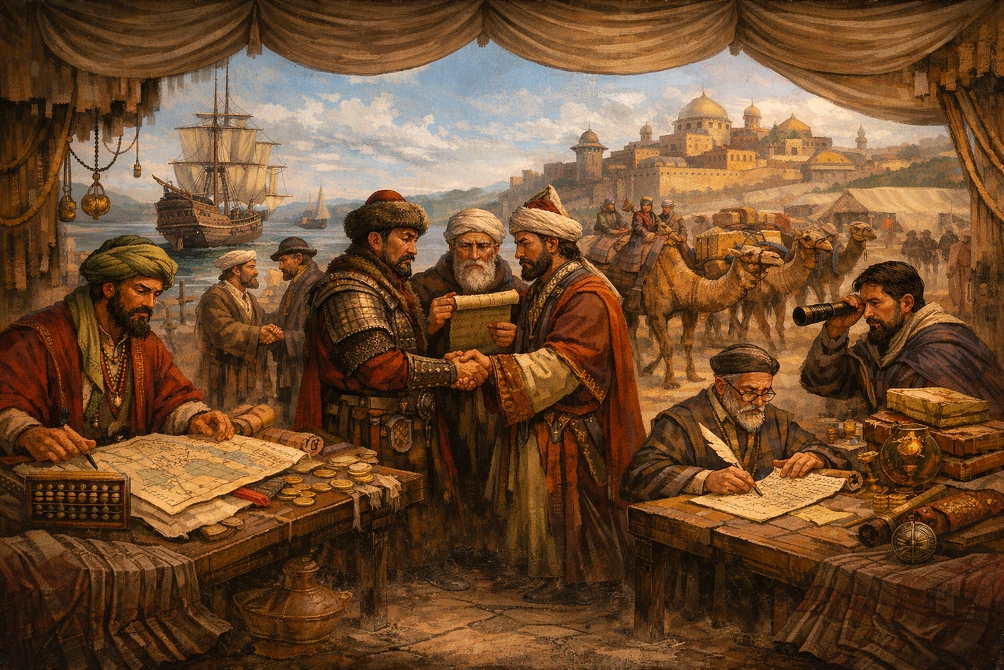 Such confederations included merchants, shipbuilders, translators, financiers, cartographers, convoy organizers, and frontier administrators—figures whose value lay precisely in their ability to move between jurisdictions without being fully absorbed by any one of them. Cohesion was maintained through shared legal regimes, ritualized trust mechanisms, standardized practices, and accumulated institutional memory rather than descent or territorial attachment. Membership was contingent and role-dependent, often reversible. Identity functioned positionally rather than genealogically, defined less by where one came from than by where one was authorized to operate at a given moment within circulating networks of exchange and obligation.