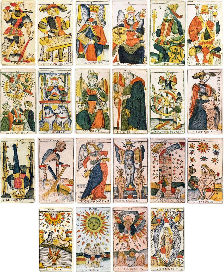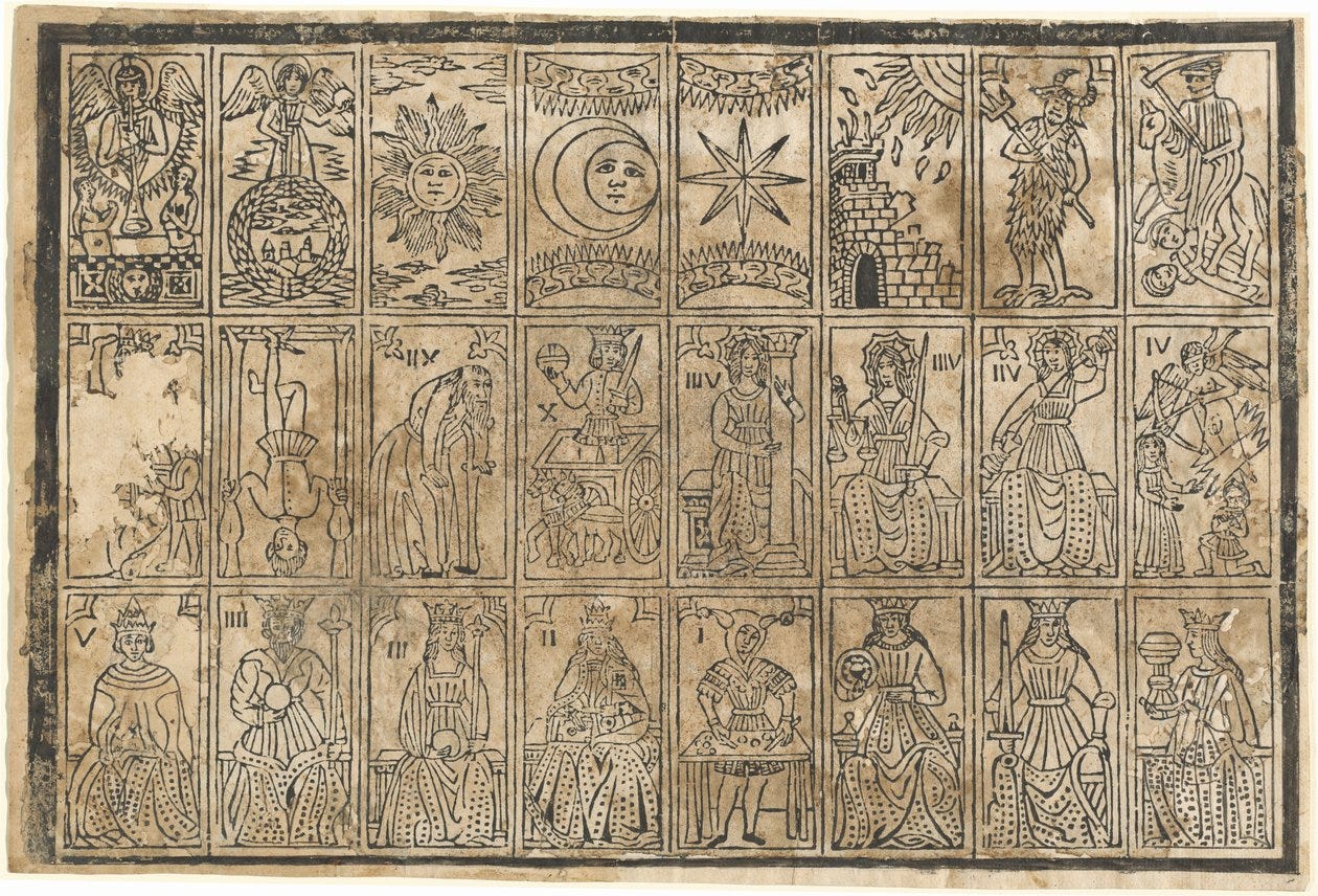For roughly three hundred years after its creation, tarot had no association with divination. It was neither a mystical system nor an occult text. It belonged to the same broad category as other forms of leisure—games shaped by artistry, craft, and the economics of printing. The idea that tarot contained ancient wisdom is a much later invention.