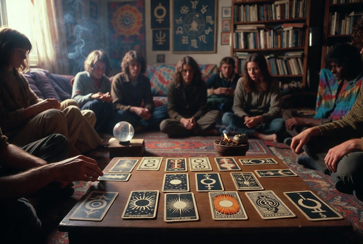 The cards migrated from esoteric lodges into living rooms, co-ops, college dormitories, and communal houses. Tarot readings appeared at music festivals, protests, and bookstores. They became woven into the visual vocabulary of the era’s underground press. Tarot stopped being a specialized interest and became a symbol of alternative spirituality itself.
