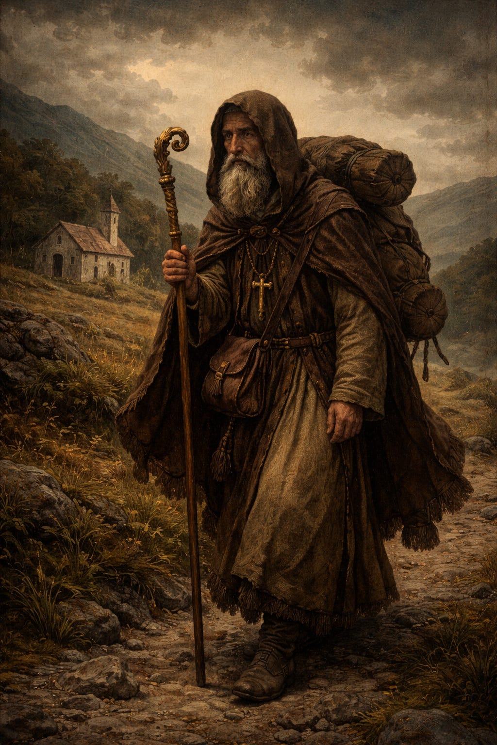 He represents what authority becomes once it detaches from territory. When jurisdiction is no longer anchored to a fixed city or administered through monumental space, power does not disappear—it reconfigures. The wandering bishop embodies this transition. He functions simultaneously as a mobile court and a portable throne, carrying lineage without infrastructure and exercising sovereignty without borders. What had once been stabilized by stone and civic geometry becomes preserved through continuity of transmission.