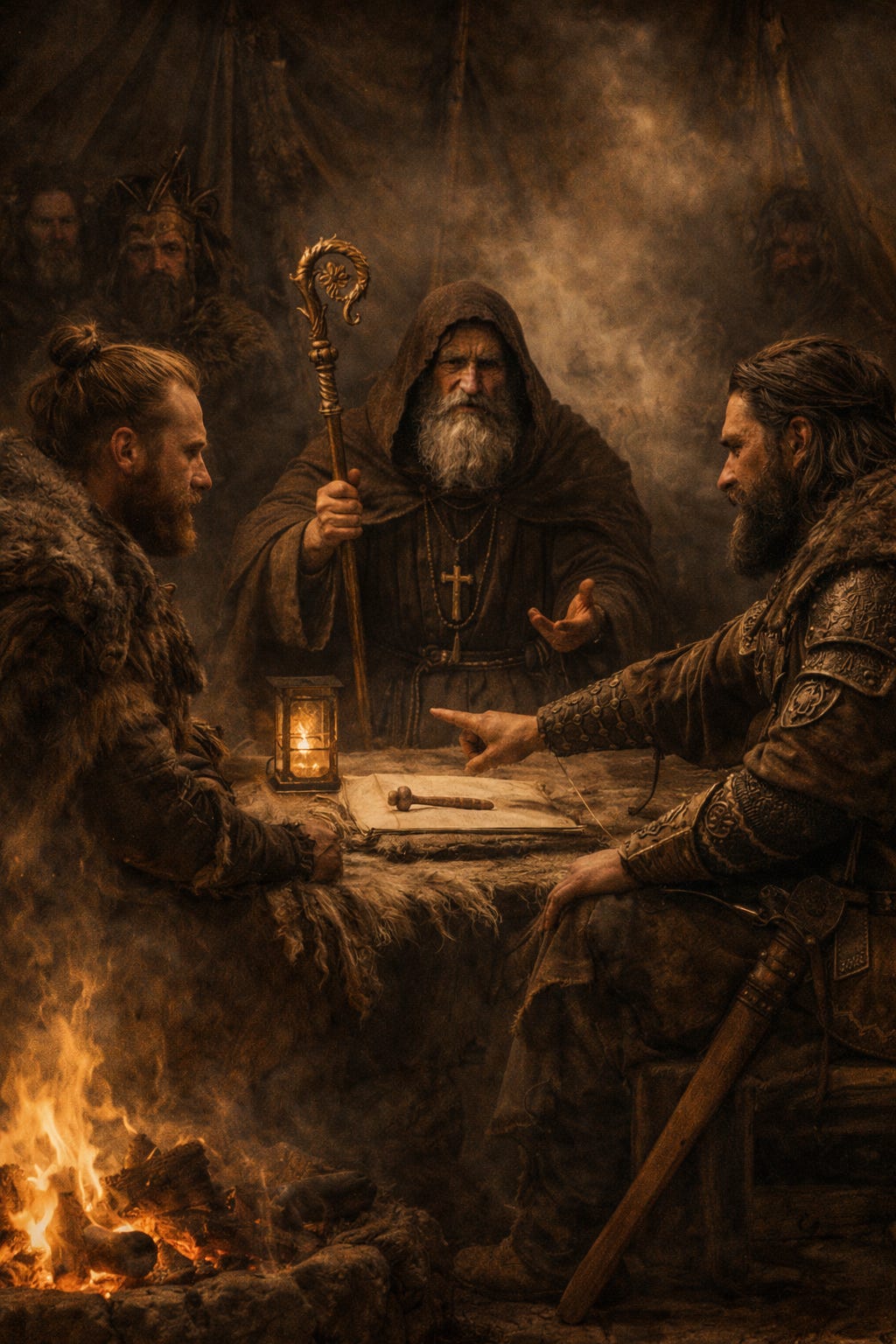 He represents what authority becomes once it detaches from territory. When jurisdiction is no longer anchored to a fixed city or administered through monumental space, power does not disappear—it reconfigures. The wandering bishop embodies this transition. He functions simultaneously as a mobile court and a portable throne, carrying lineage without infrastructure and exercising sovereignty without borders. What had once been stabilized by stone and civic geometry becomes preserved through continuity of transmission.