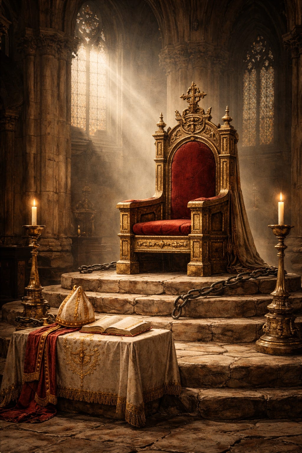 The cathedra operates according to the same symbolic logic. Remove the building yet preserve the seat—preserve the lineage, the consecration, the transmission—and authority does not vanish. It becomes mobile. Power ceases to be geographically confined and instead travels with the person who embodies it.